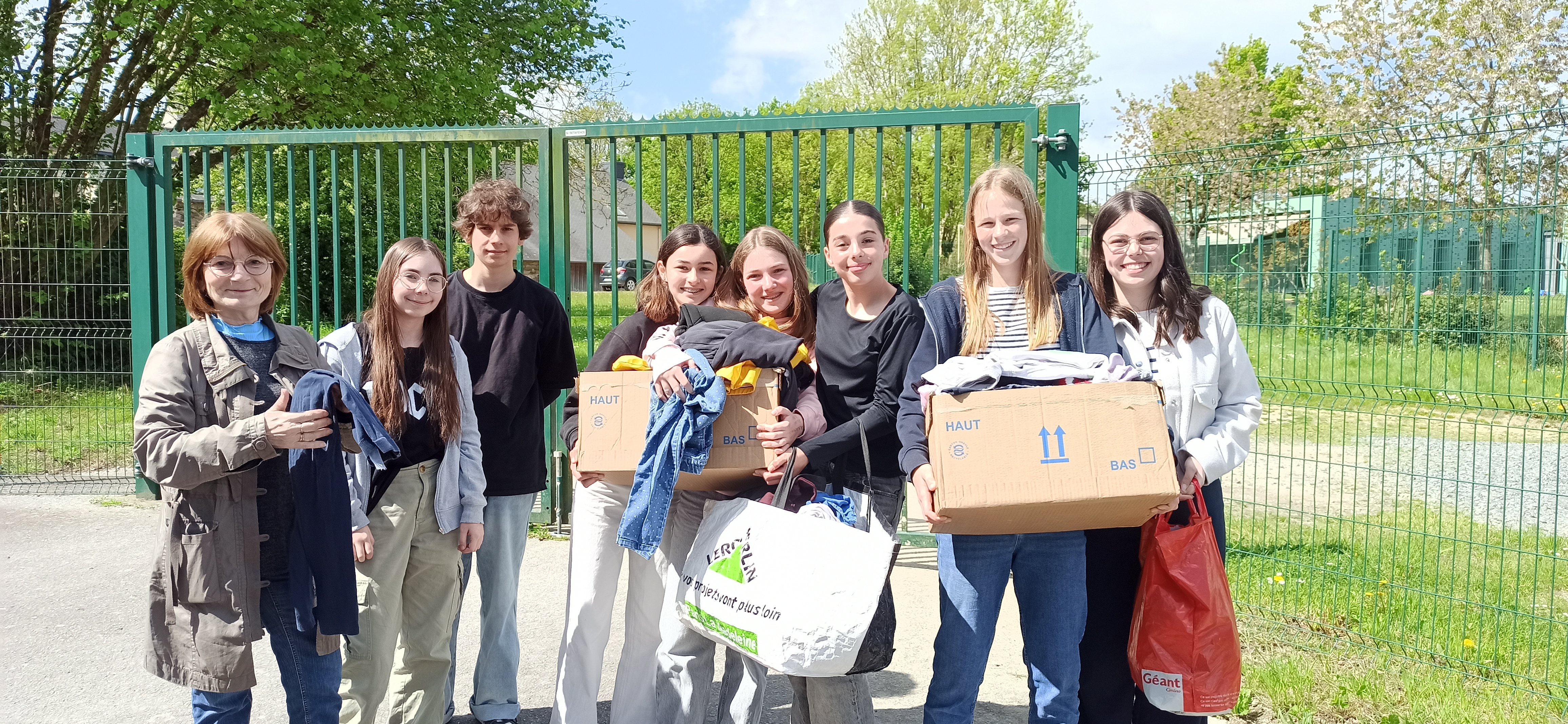 Les écollégiens, un groupe des éco-délégués du collège Sainte-Marie, ont organisé une collecte de vêtements qui s'est déroulée du 28 février au 18 mars 2025. Plus de 150 vêtements ont pu être récoltés et redistribués au Secours Catholique de Maure-de-Bretagne. Cette association caritative œuvre au profit de personnes dans le besoin en revendant ces vêtements à petits prix. La représentante du Secours Catholique, Madame HUET est venue au collège afin de rencontrer tous les écollégiens le 22 avril 2025 et était très reconnaissante de ce bel engagement. Les écollégiens remercient toutes les personnes qui ont contribué à cette magnifique collecte.