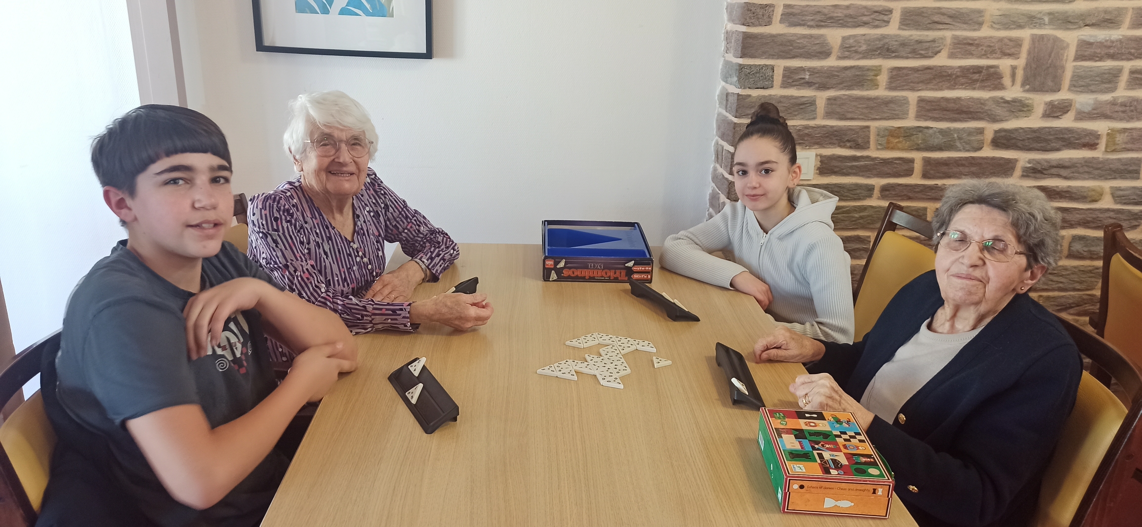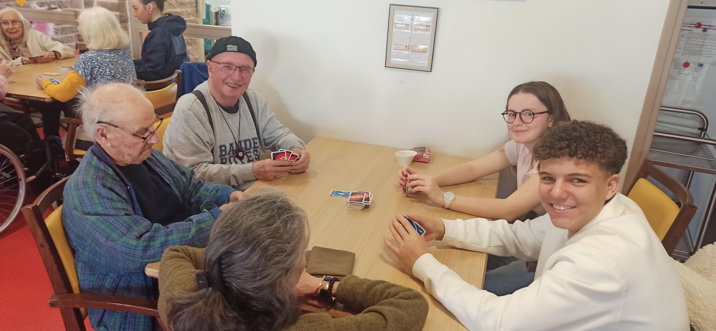 Ils ont formé un groupe de 10 élèves accompagnés de deux enseignantes. Ils ont pu rigoler et aussi discuter avec les résidents. Ceux-ci leur ont parlé de leur ancien travail, de leurs petits-enfants et de leur vie à l'EPHAD. Une résidente leur a même offert des bonbons qui leur ont fait très plaisir.